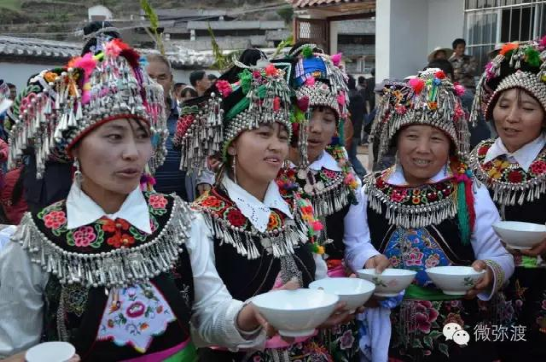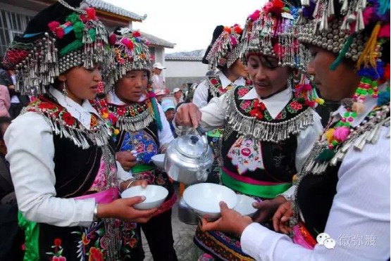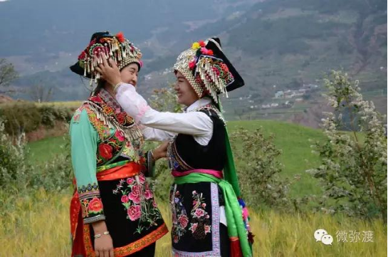 “羅羅潑支”男女服飾的特點:“羅羅潑”男子服飾與“迷撒潑”相差無幾,一般不戴白頭巾。但是婦女的服飾相差卻很大,明顯保留著古樸高雅的南詔遺風(fēng)。頭飾由桂花、包頭、飄帶、大墜子、蜜蜂墜、芝麻鈴組成。桂花墊子在裱布上蒙黑色面料,中間訂有銀飾。包頭以黑色為主,長約2米,后鏈系于包頭,鏈子為銀制。飄帶長約4尺,黑色留花邊,兩頭訂英蘇。包頭還系有大墜子、蜜蜂墜各一對,芝麻鈴20個。領(lǐng)合由裱布黑色面料上訂芝麻玲20個圍在脖子上。圍腰的前胸部,由領(lǐng)口至腹部,左右各垂掛一條綴有串珠、針筒、響篾(口弦)一類飾品和生活用品的銀質(zhì)項鏈。人一走動,全身的小蘇鈴就響,聲音悅耳動聽,形象美觀大方。額頭前還圍有一塊翠綠色的“桂花綁”,綁上釘有銀質(zhì)小泡泡200多顆,羅羅潑支婦女的服飾彰顯華麗之美。