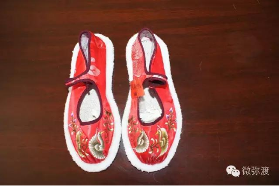 繡花鞋分大口鞋、小口鞋兩種。大口鞋大方素雅,小口鞋古樸艷麗?;佑小胺遐s梅”、“喜鵲登枝”、“獅子滾雪球“、“鳳穿牡丹”和彝族人民結(jié)婚時候,按當(dāng)?shù)仫L(fēng)俗所需必須穿的“毛邊底”等。這些花樣圖案具有不為時代變幻所動的恒久性質(zhì),蘊藏著濃厚的傳統(tǒng)民俗文化。它給予人們的絕不僅僅是絢麗悅目的美感,還是彝民們征服自然,繁衍生息,爭取愛情和歡樂的記錄。