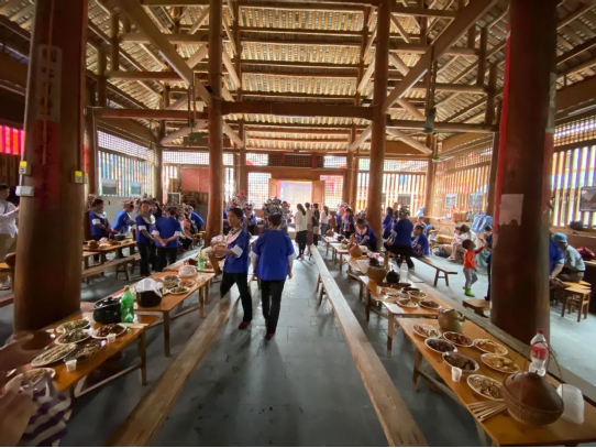 “百家宴”是侗族待客的最高禮儀。每逢村寨互訪或有特別尊貴的客人來時,全村各戶自備酒菜飯,一起到鼓樓坪“一”字型擺開長桌,客人可從第一桌吃到最后一桌,你來我往、觥籌交錯、熱鬧非凡。據(jù)說在當(dāng)?shù)亓鱾髦@樣一個說法:“吃百家飯、納百家福、聯(lián)百家心、驅(qū)百家邪、成百樣事、享百年壽”——各寨