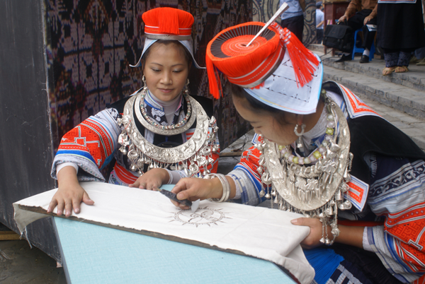 經(jīng)過層層選拔出的100名繡娘在此飛針走線,同秀技藝,展現(xiàn)了少數(shù)民族民間文化獨(dú)特的藝術(shù)魅力。