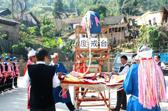 “度戒”臺(俗稱“巫臺”,亦稱“神臺”或“五臺山”)設(shè)在村子下面的一塊小地里,因這次有兩人“度戒”,便并列設(shè)了兩個“巫臺”?!拔着_”搭得較簡單,先在場地上打4棵木樁,用四方桌作臺頂,桌子的4腳分別捆在木樁上,臺高約4米;“巫臺”前搭有一架有5個臺階的木梯,等“度戒”者送上臺后便把木梯砍掉;臺后有一張用大青藤編成的狀如蛛網(wǎng)的大網(wǎng),上面鋪著幾床新被子,約有10人對稱拉開,等“度戒”師下令,“度戒”者從“巫臺”上仰面滾落下來。拉網(wǎng)的人乘“度戒”者墜落進網(wǎng)之勢,把他輕放于地上,并將手中之繩速向?qū)Ψ綊仈n,“度戒”師看了其落地的姿勢可以,此次“度戒”便算成功了。