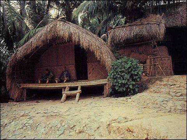 船型屋作為黎族最古老的民居,有高架船型屋與低架(落地式)船型屋之分,其外形像船篷,拱形狀,用紅、白藤扎架,拱形的人字屋頂上蓋以厚厚的芭草或葵葉,幾乎一直延伸到地面上,從遠處看,猶如一艘倒扣的船。其圓拱造型利于抵抗臺風的侵襲,架空的結構有防濕、防瘴、防雨的作用,茅草屋面也有較好的防潮、隔熱功能。而且能就地取材,拆建也很方便。鑒于這些優(yōu)點,船形屋得以世代流傳下來。