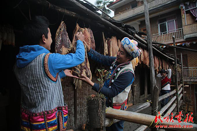 郁伍林和兒子郁樂(lè)選取怒族特色食材之一琵琶肉(臘肉)