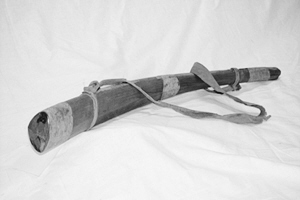 這只紅松木質(zhì)地的鹿哨呈牛角形,中間鏤空,以細鱗魚皮熬膠粘合,頭部細,尾部粗,呈喇叭狀;在頭、尾、中間箍三道箍,在接近頭尾的兩端纏細皮繩為環(huán),環(huán)上系寬皮帶,便于出獵時背挎于肩或平時懸掛。它在現(xiàn)存同類器物中制作時間較早,源流、傳承清晰。在它質(zhì)樸的外表下,集中體現(xiàn)了北方狩獵民族的生活經(jīng)驗、創(chuàng)造智慧以及審美觀念。