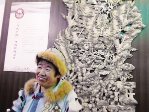 在展廳里,幾位來自黑龍江的手工藝人還現(xiàn)場展示了魚皮制作技藝。64歲的劉升從事魚皮制作已近20年,被評為黑龍江省工藝美術(shù)大師。她告訴記者,赫哲族過去主要用魚皮制作衣服,現(xiàn)在則用魚皮制作各種工藝品、小掛飾。在她身后,掛著一張長兩米多、寬約1.5米的魚皮畫《還魂薩滿》,展示了赫哲族神話傳說中的圖景,有薩滿、有森林、大鳥和各種圖騰,充滿了原始而神秘的氣息。劉升說,這還只是未完成的作品,但已用了3000多張大馬哈魚皮。