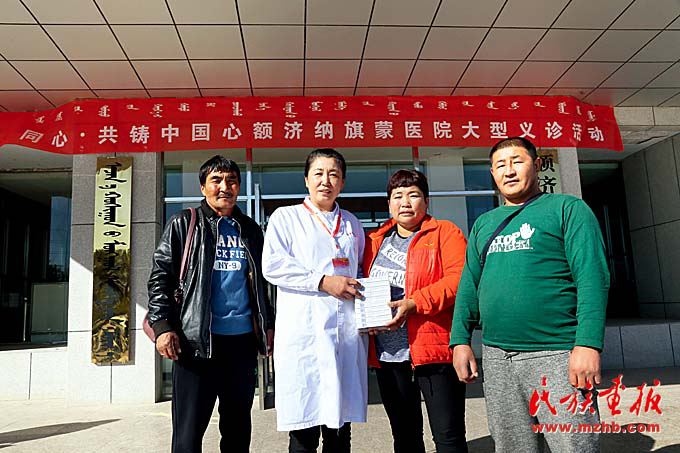 在額濟(jì)納旗蒙醫(yī)醫(yī)院開(kāi)展的義診活動(dòng)上,專家們向蒙古國(guó)患者贈(zèng)藥。