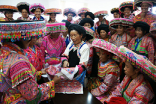 云南省南澗傳統(tǒng)的苗族服飾,均用多色麻線制作而成。在苗族服飾中,最讓人新奇的是女人的頭飾。苗族姑娘,習挽犄角形單發(fā)髻于頭頂,并將髻編于左或右。束發(fā)常用紗、綢帶,不同的苗族支系,采用的紗、綢顏色和花紋也有所不同,有的還佩戴系有“百家鎖”的銀項圈等。已婚婦女,一般都行編發(fā),并將發(fā)辮沿頭頂邊緣繞起來,而且多以彎月形的梳子卡插于發(fā)盤頂心。在苗家人中,婦女的頭飾尤其特別,每逢喜事,他們都挽發(fā)髻如螺形,用較長的青布或黑布,按縱向折疊為長條,由一端起緊緊地盤繞于適合自己頭型的頂制帽基上。在疊繞成的大包頭之最外層表面上,配縫以彩帶垛疊的橫條,釘以32-48個貝雕,環(huán)圈密綴十字形亮子線,懸垂約5厘米的小銀鏈數(shù)10條,以及小銀鈴若干串。除精制的頭飾外,苗族女人的上衣下著都頗具特色。上衣有平裝和禮裝,下著有各式褶裙,腰上系的有桃花圍腰或有須腰帶。有的還有精美別致的短衣,也有特顯精巧的無袖布褂,以及彩繡鑲邊的布涼鞋等。在繁多的苗族服飾中,最顯著的特色是,不論衣裝大小,也不論上衣下著,在衣領(lǐng)、袖口、裙邊、裙底上,都鑲有臘染圖案和“米”字形花紋的條幅。苗家人穿上自己繡制的服飾,情趣非同一般,尤其是那些將要出嫁的大姑娘或已經(jīng)過門的新娘子,更會把自己打扮得花枝招展,漂亮迷人,對自己美如畫卷的服飾她們也是珍愛如寶。苗族男人的服飾,比女人簡單,上衣為對襟短衣,下著褲子,一般也以短褲較多,頭飾多為半球形布帽或頂發(fā)外露的青色小包頭,但都有精制彩繡垛邊。大量使用飾物和刺繡,是苗族服飾的最大特色。