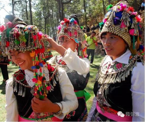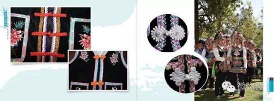 “羅羅潑支”男女服飾的特點(diǎn):“羅羅潑”男子服飾與“迷撒潑”相差無(wú)幾,一般不戴白頭巾。但是婦女的服飾相差卻很大,明顯保留著古樸高雅的南詔遺風(fēng)。頭飾由桂花、包頭、飄帶、大墜子、蜜蜂墜、芝麻鈴組成。桂花墊子在裱布上蒙黑色面料,中間訂有銀飾。包頭以黑色為主,長(zhǎng)約2米,后鏈系于包頭,鏈子為銀制。飄帶長(zhǎng)約4尺,黑色留花邊,兩頭訂英蘇。包頭還系有大墜子、蜜蜂墜各一對(duì),芝麻鈴20個(gè)。領(lǐng)合由裱布黑色面料上訂芝麻玲20個(gè)圍在脖子上。圍腰的前胸部,由領(lǐng)口至腹部,左右各垂掛一條綴有串珠、針筒、響篾(口弦)一類飾品和生活用品的銀質(zhì)項(xiàng)鏈。人一走動(dòng),全身的小蘇鈴就響,聲音悅耳動(dòng)聽,形象美觀大方。額頭前還圍有一塊翠綠色的“桂花綁”,綁上釘有銀質(zhì)小泡泡200多顆,羅羅潑支婦女的服飾彰顯華麗之美。