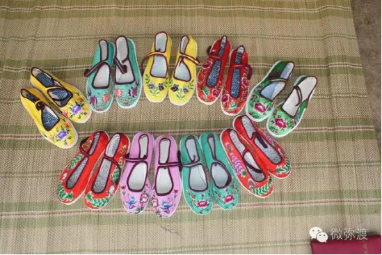 繡花鞋分大口鞋、小口鞋兩種。大口鞋大方素雅,小口鞋古樸艷麗?;佑小胺遐s梅”、“喜鵲登枝”、“獅子滾雪球“、“鳳穿牡丹”和彝族人民結(jié)婚時(shí)候,按當(dāng)?shù)仫L(fēng)俗所需必須穿的“毛邊底”等。這些花樣圖案具有不為時(shí)代變幻所動(dòng)的恒久性質(zhì),蘊(yùn)藏著濃厚的傳統(tǒng)民俗文化。它給予人們的絕不僅僅是絢麗悅目的美感,還是彝民們征服自然,繁衍生息,爭(zhēng)取愛情和歡樂的記錄。