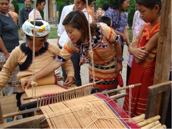 2010年上海世博會活動周期間,一臺名為《記憶云南》的18項(xiàng)非物質(zhì)文化遺產(chǎn)展示成為最吸引眼球的亮點(diǎn)之一?;顒蝇F(xiàn)場,18名云南非物質(zhì)文化遺產(chǎn)傳承人和民間藝人展示白族布扎、納西族東巴畫、傣族剪紙、傣族竹編、佤族織錦技藝等制作技藝。其間展示的佤族織錦技藝在民族文化風(fēng)情濃郁,文化底蘊(yùn)深厚的耿馬縣佤族村寨里流傳甚廣。在耿馬的佤族村寨里,婦女們一般都會紡線織布,佤族傳統(tǒng)服飾也多用自染自織的土布縫制。此地佤族傳統(tǒng)服飾按地域分為兩大類。一類是分布在耿馬鎮(zhèn)、四排山鄉(xiāng)的傳統(tǒng)服飾,以女性身著佤族紅色短衣筒裙、男子身著佤族黑衣寬褲為標(biāo)志;一類是分布在勐簡鄉(xiāng)大寨村的“黃衣阿佤”服飾,以女性身著佤族黃衣筒裙、男子身著黃衣寬褲為標(biāo)志。佤族婦女所用的紡線有棉線、麻線兩種。棉主要是草棉,麻主要為苧麻和野生火麻,紡線采用內(nèi)地傳入的有紡錘的紡車。在耿馬鎮(zhèn)芒國村芒俄村民小組等佤族聚居村寨,筆者先后目睹了佤族織錦的全過程。只見紡織 中的佤族婦女一個(gè)個(gè)端坐在紡車前,凝神專注地操持著手中的活計(jì)。她們左手持麻,右手持紡錘,將紡錘放在大腿上一搓,紡錘轉(zhuǎn)動起來后,把麻纖維慢慢從左手拉出并捻成線,紡好一截線便將它繞到小竹棍上。如此這般不停地左右穿梭,又不斷地再搓、再捻,紡出的布匹紋理細(xì)密、結(jié)實(shí)挺拔。耿馬四排山鄉(xiāng)織錦的佤族婦女,大多采用一套竹木制的很原始的腰機(jī),前后上下共有十七個(gè)零件。紡線時(shí),她們將線的一頭栓在婦女腰上,另一頭用木棍穿好,擱在織布處釘在地上的兩根木樁上。織時(shí)兩頭繃緊,將繞在木棍上的緯線穿到經(jīng)線的中間,然后用抒刀把線打緊。這種織法節(jié)奏雖然慢一些,但織出的布更加厚實(shí)緊繃,適用于紡織粗布和麻袋。在勐簡鄉(xiāng)大寨村的穿“黃衣”的佤族婦女,用黃土、玉米粉、茶葉、小飯豆、欖樹皮等7種植物做原料浸染的黃色棉線織錦,使用的有竹木制腰機(jī)和紡錘紡車兩種。織錦時(shí),只見她們一邊捻線,一邊傳遞紡錘。不織時(shí),又把紡錘和抒刀拆下,依然卷起放好。來自耿馬鎮(zhèn)、四排山鄉(xiāng)、勐簡鄉(xiāng)的佤族群眾介紹,中華人民共和國成立后,由于商店里賣的布料比佤族自織的布料更價(jià)廉物美,佤族人家自己紡織制作服飾的已經(jīng)不多,但是縫制麻布被和麻袋用的麻布,還是多數(shù)來源于自家紡織,尤其是佤族村寨婦女穿的裙子,也必須是自己織,不然會被人同族人恥笑為愚笨和懶惰。2009年以來,每年5月中旬,耿馬都要舉辦佤族“青苗節(jié)”慶典活動。活動期間,該縣不僅上演豐富多彩的文藝節(jié)目和民間體育比賽項(xiàng)目,還現(xiàn)場展示該縣獨(dú)具特色的佤族織錦技術(shù)??楀\展示中,來賓增長了對佤族傳統(tǒng)手工技藝方面的知識,不少圍觀群眾還饒有興趣地一邊詢問織錦者,一邊親自動手體驗(yàn)這項(xiàng)古老而傳統(tǒng)的紡織技藝。