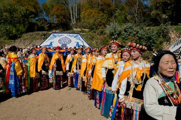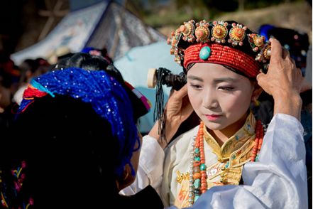 盤好發(fā)髻,佩戴好頭飾,在肩、背系好五彩哈達(dá)后,由本村具有威望的女性長者引領(lǐng)來到儀式現(xiàn)場。法號聲中,煨桑的青煙裊裊升起,威嚴(yán)的活佛主持誦經(jīng)祈福儀式。隨后,德高望重的長者為參加儀式的女子送祝福茶,長輩為姑娘們獻(xiàn)哈達(dá)。一系列儀式結(jié)束后,無論男女老少,都來到場地中央,踏歌起舞,跳起吉祥的鍋莊。