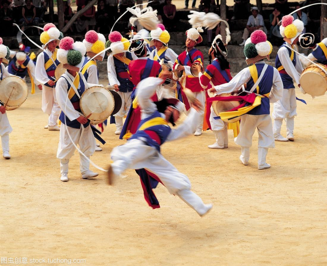 說起朝鮮族的四物樂就不得不先說朝鮮民族民俗音樂文化產(chǎn)生的背景。通過眾多資料可以看出,朝鮮民族文化可以追溯到新石器時(shí)代。在古代前期的音樂文化主要是原始共同體社會(huì)里祭天儀式中的樂歌舞,也就是初步的器樂、聲樂以及舞蹈三位合一的表現(xiàn)形態(tài)。