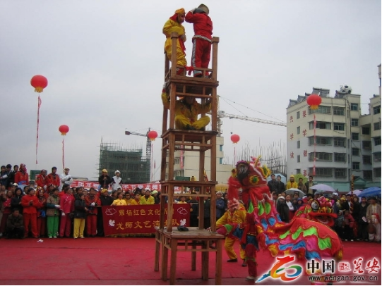 高臺(tái)是用5至7張八仙桌一層層疊壘,最上面的桌子四腿朝天,總高度近8米。四人登臺(tái)表演。兩個(gè)人扮獅子,把獅頭獅皮披在身上,只露雙腳;另外兩人分別裝扮成孫悟空和笑臉和尚揮舞手帕,大蒲扇逗引獅子逐層攀上高臺(tái),為了穩(wěn)固,安全起見,每張桌子的四角都用草紙疊浸水后墊著防滑,做到萬無一失。