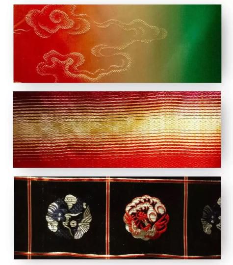 民族錦一般采用多色彩條嵌入金銀絲織成,多用于民族服飾,故名。其特點(diǎn)是錦面上的圖案從經(jīng)緯線交織中顯現(xiàn)出自然光彩,富有光澤。常見的圖案有團(tuán)花、葵花、“萬”字“壽”字等。彩暈錦的特點(diǎn)是織紋華貴相映,明暗匹配,層次分明,并以色暈過渡,花紋絢麗多彩,別具一格。