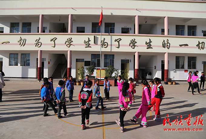 看過(guò)臘灣民族小學(xué)課間操的人都會(huì)說(shuō):“臘灣民族小學(xué)的課間操都是跳出來(lái)的?!比欢?,對(duì)于這所雙語(yǔ)教學(xué)的民族小學(xué)來(lái)說(shuō),其民族特色遠(yuǎn)不止于此。穿彝族傳統(tǒng)服裝、講彝語(yǔ)也是這里的教育特色。