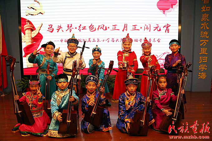 2019年2月19日,中國科學(xué)院附屬玉泉小學(xué)在北京舉行“馬頭琴·紅色風(fēng)·正月正·鬧元宵”馬頭琴藝術(shù)團專場音樂會。音樂會上,學(xué)生們先后演奏了《草原連著北京》《草原上升起不落的太陽》《搖籃曲》《嘎達梅林》等經(jīng)典民族曲目。