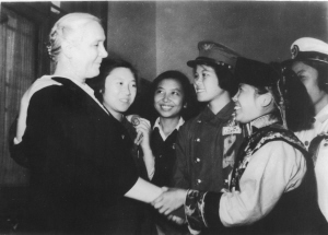 1955年9月蘇聯(lián)卓婭和舒拉的媽媽(左一)訪問中國(guó)時(shí)接見中國(guó)的“瓦爾瓦娜”(蘇聯(lián)電影《鄉(xiāng)村女教師》女主角)、全國(guó)青年社會(huì)主義建設(shè)積極分子阿角(右一),時(shí)有郝建秀(左三)、徐建春(左二)同志在場(chǎng)。 資料圖片