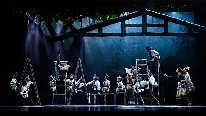 “花腰帶”既是精美的舞蹈道具,又是劇中人物情感的寄托,在整部舞劇中反復(fù)出現(xiàn)。特別是在雙人舞中,“花腰帶”將人物間無形的關(guān)系幻化成有形的聯(lián)系。劇中的蘆笙舞段,不僅僅是男女之間情愛的表達(dá),更突出表達(dá)了“開山人”為了讓窮鄉(xiāng)告別貧苦,為大愛舍小愛、努力奮斗的決心,以及對(duì)美好生活的向往。傳統(tǒng)民族舞蹈在這部劇中被賦予了不同的含義。