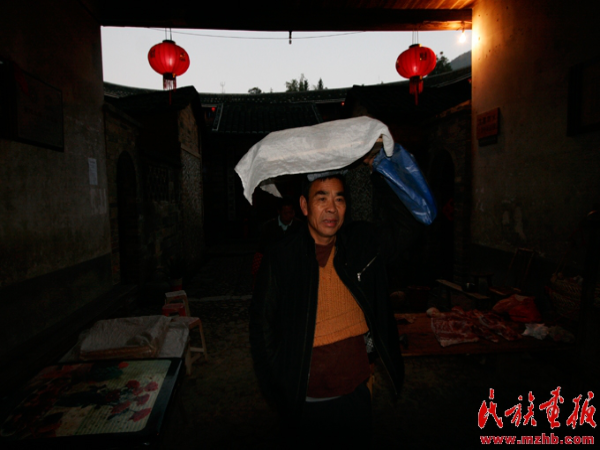 傍晚六點(diǎn),江勝洪等人相繼趕到承啟樓祖堂。在那里,“龍”已經(jīng)倚靠在墻邊,靜靜地等待一年僅有的這幾天。人們首先給龍頭系上一塊紅布,象征吉祥。另一邊,排在第11位的江斌正在往竹筒里灌煤油,做晚上上山的火把。
