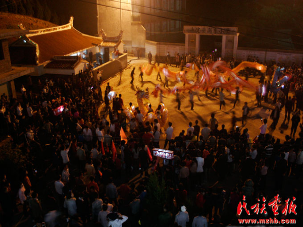 高頭鄉(xiāng)每個村各個片都至少有一條“龍”,每年元宵節(jié)都會有盛大的舞龍活動,熱鬧程度比起春節(jié)有過之而無不及。盡管現(xiàn)在承啟樓很多年輕人春節(jié)剛過就要出門做工或上班,但更多年輕小伙子還是要等幾天舞完龍再走。舞龍負(fù)責(zé)人并不固定,一般都是上一年結(jié)婚的年輕小伙子。如果上一年結(jié)婚的年輕人不止一個,最早結(jié)婚的那個年輕人為頭人,按照結(jié)婚時間先后,其他人座次依次排列。一般舞龍頭的就是這位最早結(jié)婚的年輕小伙子。