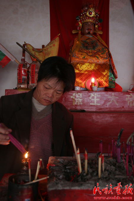 兩年來,作為保生大帝廟守廟人,江云山早上起來最重要的事情就是打開廟門,給諸神上香,敬茶。除了保生大帝神外,廟里還供奉有關(guān)公和文昌君。人們一般向關(guān)公神祈求發(fā)財,向文昌君神祈求兒女考上大學(xué),早日成才。江云山說,只要真心信奉,人們來年各方面的愿望都會得到神靈的保佑。