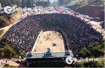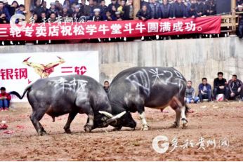 貴州省從江縣第十五屆原生態(tài)侗族大歌節(jié)的前一天,恰逢該縣逢亥斗牛日,丙妹鎮(zhèn)松學(xué)斗牛塘、谷坪鄉(xiāng)四寨河斗牛塘同時舉辦傳統(tǒng)牛王爭霸賽,喜迎一年一度“侗族大歌節(jié)”的到來,共有來自周邊村寨的80頭水牯牛參戰(zhàn),斗?;顒訄錾厦=侵?,場面異彩紛呈,吸引數(shù)萬名觀眾前來觀戰(zhàn)。