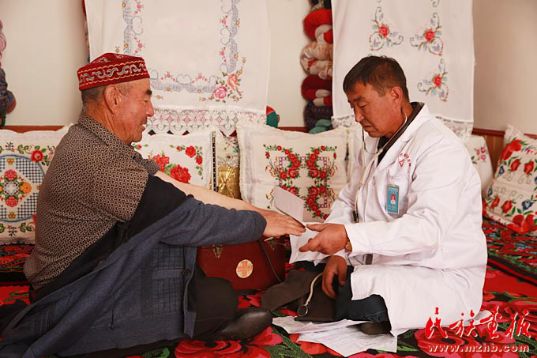 “這兩年,包扎墩冬牧場(chǎng)的變化太大了。這里以前沒(méi)有電、電話和道路,牧民就醫(yī)十分困難。但黨中央沒(méi)有忘記生活在這里的牧民,不僅在這里新建了衛(wèi)生所,而且還通了電、電話和柏油路……這都得益于國(guó)家的好政策。醫(yī)療力量不斷得到充實(shí),原來(lái)這里只有兩名醫(yī)生,到現(xiàn)在有8名醫(yī)務(wù)工作者,基本滿足牧民的就醫(yī)需求。老鄉(xiāng)們看病不發(fā)愁,是我最大的愿望?!本玉R泰·俄白克很欣慰地說(shuō)。