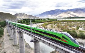 蒼翠的雅魯藏布江河谷中,全新的復(fù)興號列車呼嘯而過,與奔騰的江水一起向著“西藏江南”林芝駛?cè)ァ?/p>