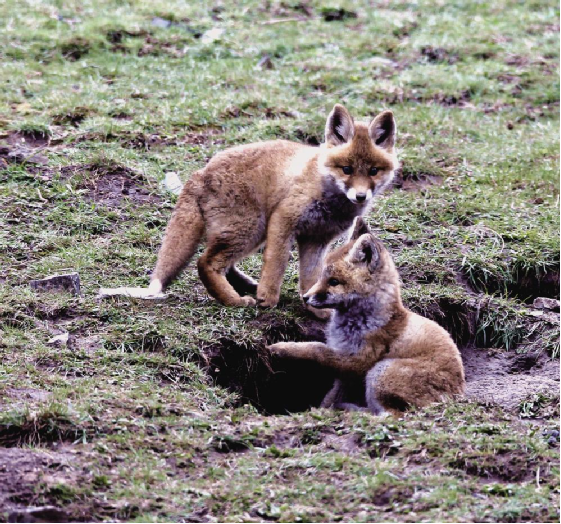藍天白云,微風(fēng)輕漾;草地碧綠,鳥語花香。大自然的美景圖正在小赤狐的家園四周徐徐展開。在膽大的小赤狐的叫喚聲里,躲在洞內(nèi)的另外兩只小赤狐也壯著膽子探出頭來。不一會兒,它們習(xí)慣了周圍的環(huán)境,三只小赤狐在離洞口5米遠的范圍內(nèi)嬉戲玩耍著。它們時而跳躍,時而奔跑,展現(xiàn)出本能的捕獵動作。稍大一點的小赤狐騎在小一點赤狐的背上嬉戲玩耍,小赤狐也不示弱,奮力反擊,猶如兒童打鬧,其樂無窮。那烏黑溜圓的眼睛彎了又彎,毛茸茸的尾巴高高地翹起,身體嬌小,惹人喜愛,讓人看了會產(chǎn)生想上去抱一抱、摸一摸小赤狐身軀的念頭。