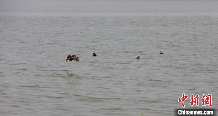 鳥兒在南宮湖濕地公園飛翔?!√锿z