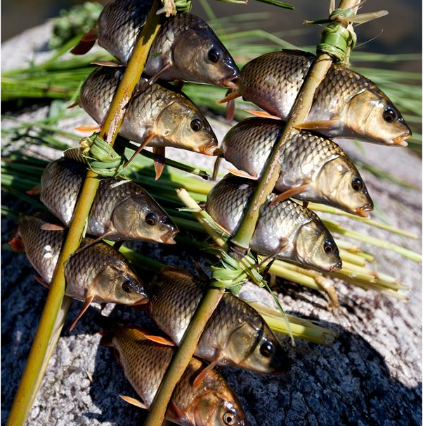 苗家人吃魚的方法有煮、炒、腌酸、晾干等,而最具風(fēng)味的要數(shù)用火炭燒烤至熟,味道以鮮、美、嫩、香、甜為特色,而且吃法也新穎別致,饒有情趣。