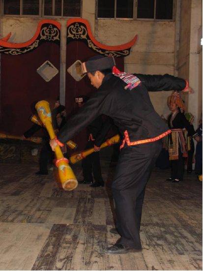 長鼓舞,是瑤族民間的傳統(tǒng)舞蹈,流傳年代久遠(yuǎn)。《評王券牒》多有記載,瑤族人民很早就有踏歌擊長鼓而舞的習(xí)俗。桂北、湘南瑤區(qū),在民間留存的碑刻中,也有瑤族“擊長鼓”的記載,進(jìn)入明、清時期,長鼓舞更為廣泛流行,每逢年節(jié)和祭祀盤王,都敲擊長鼓歡慶豐收。長鼓舞一般由四男執(zhí)鼓起舞,四女(一老三少)唱盤王歌助興,以铓鑼、皮鼓、嗩吶伴奏。舞姿剛健,風(fēng)格淳樸,具有濃厚的民族特色。舞蹈中的跳、躍、蹲、挫、或旋轉(zhuǎn)、翻撲、仰騰等動作,再現(xiàn)了開荒、耕種、伐木、拉鋸、蓋屋等生產(chǎn)生活情形,充分反映了瑤族人民過去“今歲此山,明年又別嶺矣”的遷徙生活特點。